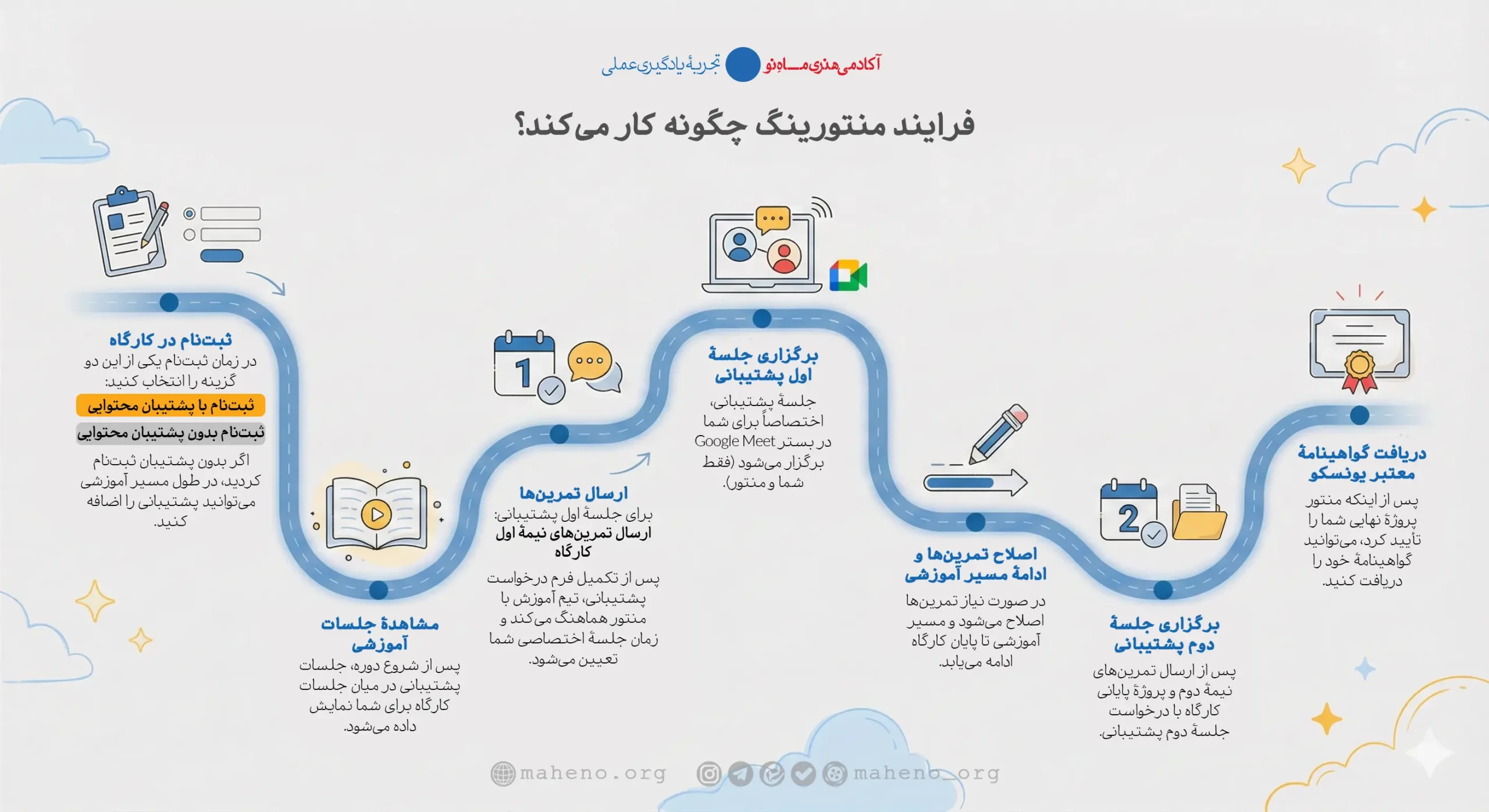 در آکادمی هنری ماه نو، آموزش در تماشای ویدئو خلاصه نمی‌شود. هر کارگاه یک «مسیر» دارد و منتور در نقاط کلیدی این مسیر وارد می‌شود تا مطمئن شود دانش شما به توانایی عملی تبدیل شده است.